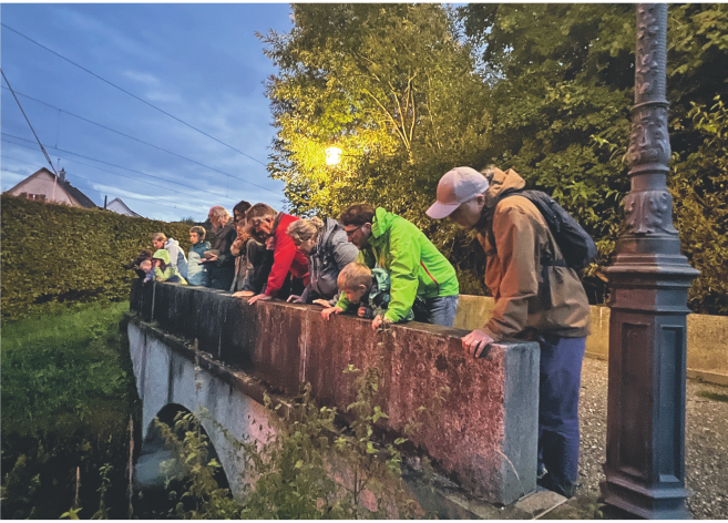 Optisch unterscheiden könne man sie auch am Aussehen, zum Beispiel an den Flügeln: «Alle Arten sind auf ein anderes Leben spezialisiert», so Haller. Der Experte informierte die Exkursionsgruppe auch darüber, dass es sich bei den Fledermäusen um Säugetiere handelt. «Sie beginnen ihre Jagd in der Dämmerung und jagen nachtsüber, je nach Art Insekten oder auch Käfer, in der Luft, auf dem Boden oder nahe über dem Wasser», erklärte er weiter. Für die Weibchen sei die anspruchsvollste Zeit während der Aufzucht, weil sie neben der Futtersuche immer wieder in ihr Quartier zurückkehren müssen, um die Jungen zu säugen. Dies etwa sechs Wochen lang, die ganze Nacht hindurch. Faszinierend sei es auch, die Tiere zu beobachten, wie sie von den Eltern fliegen und jagen lernen.