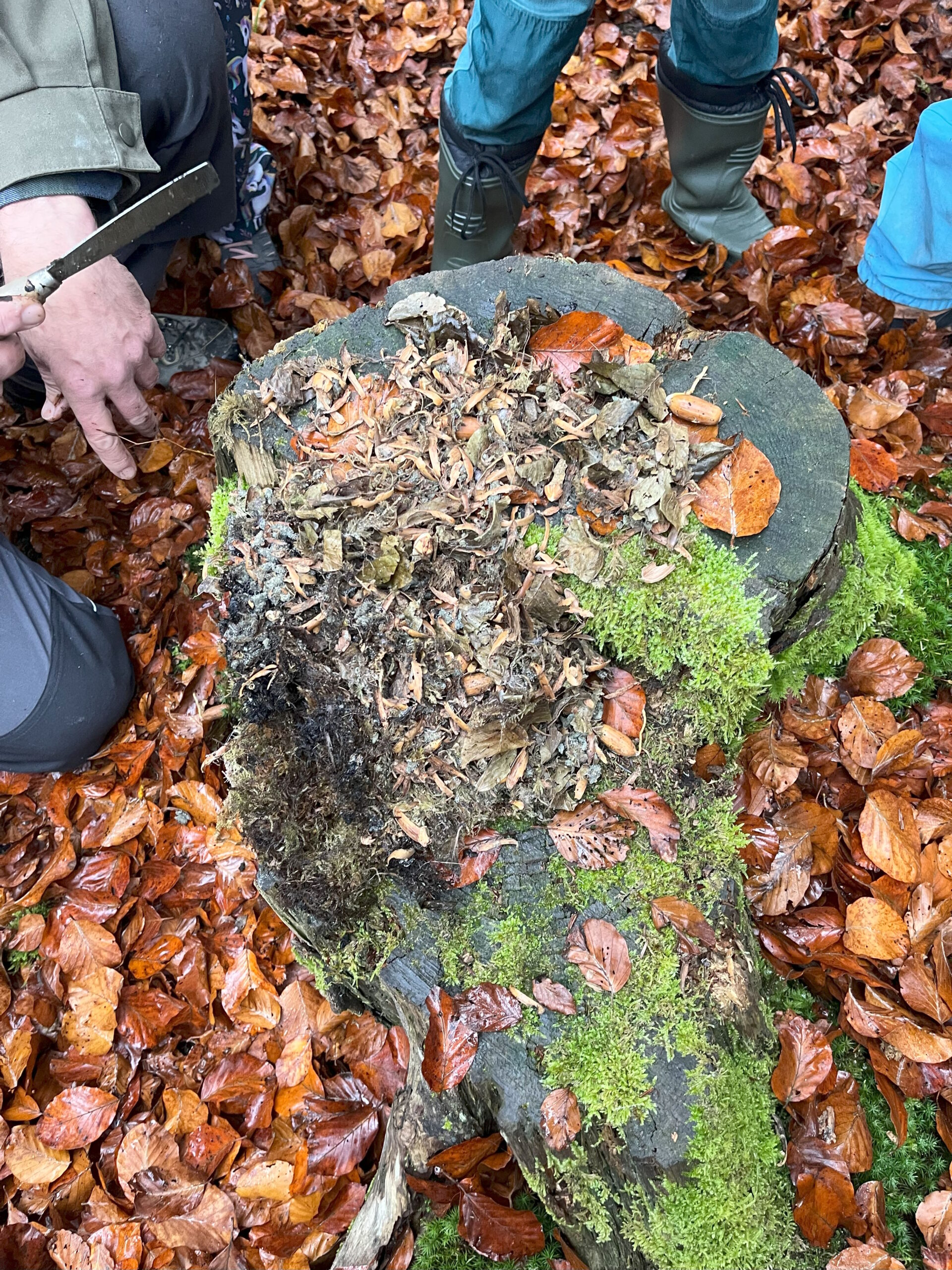 Bei vielen Häuschen hatten wir wie hier die Situation, dass das Meisennest nicht mehr gut erkennbar war, weil, nachdem die Meisen ausgeflogen waren, sich eine Maus oder ein Siebenschläfer in dem Haus breit gemacht hatte. Dies erkennt man gut an den Blättern, Buchennüsschen und den Eicheln. Auf dem nächsten Bild ist das sogar noch besser erkennbar.